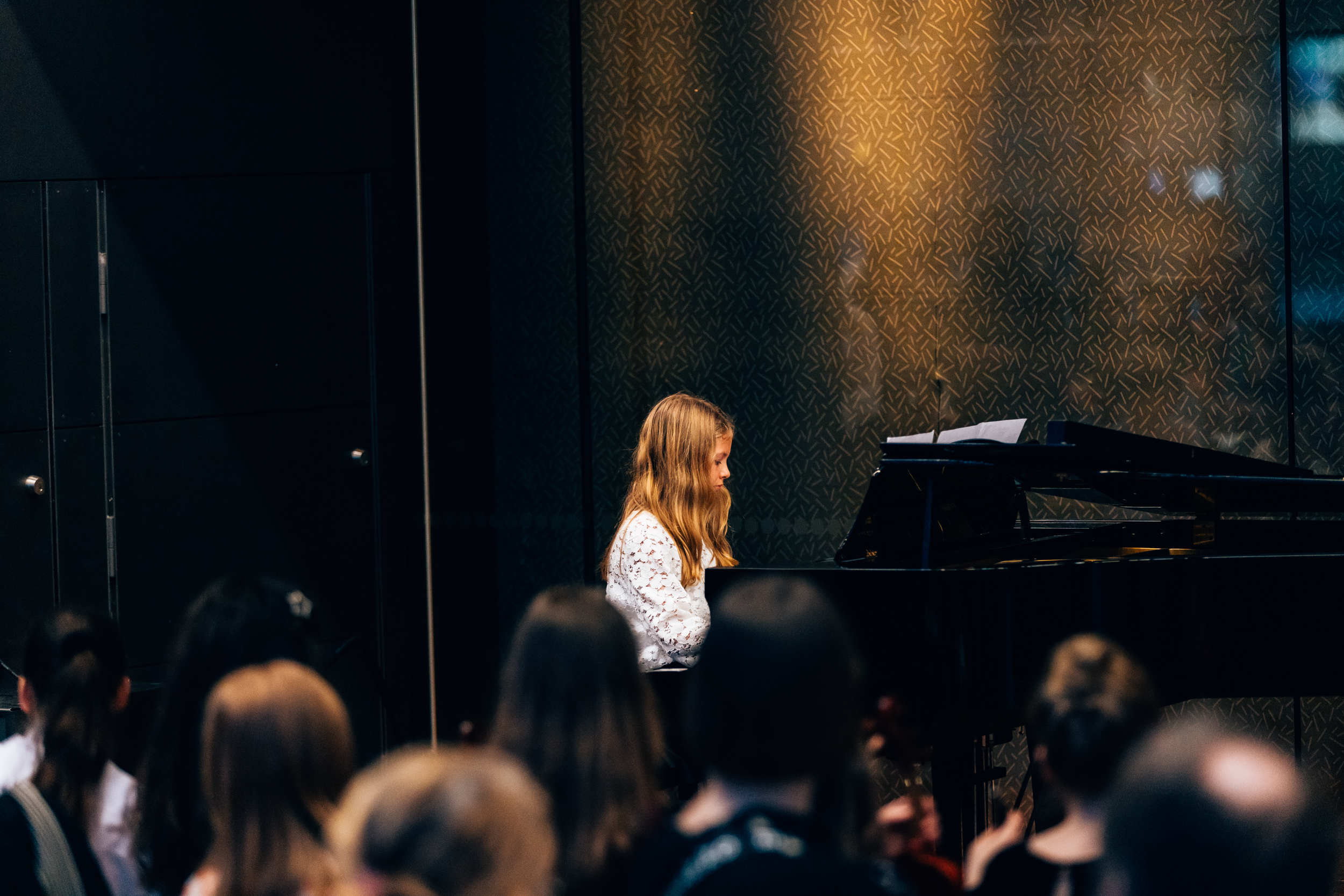 Elever från musikinstituten i Helsingfors uppträder i Musikhusets huvudfoajé före HSOs konserter inleds.