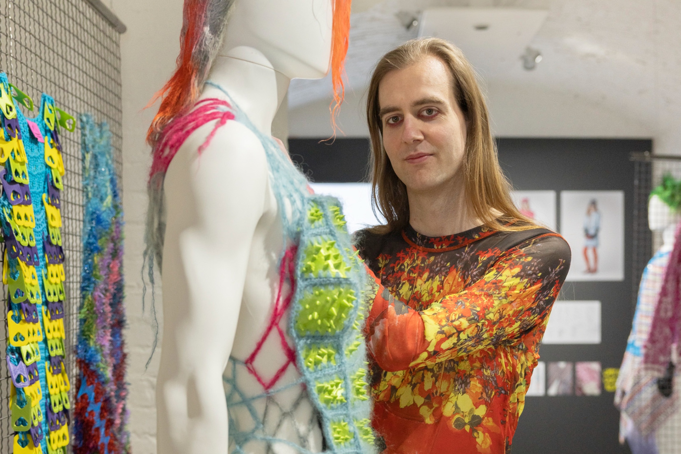 Kom och träffa stickkonstnären Juha Vehmaanperä i Craft Punk-utställningens gemensamma konstutrymme för stickning, samtal och handledning. Hen arbetar med sitt stickprojekt i utställningsrummet .