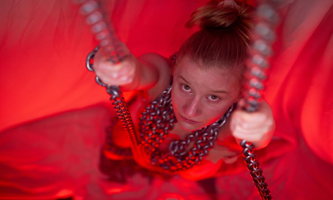 På scenen ser vi en person vars luftakrobatik på metallkedjor är både brutal och vacker. Kedjorna är både ett hinder och en möjliggörare, ett maktinstrument och en frihetssymbol.
